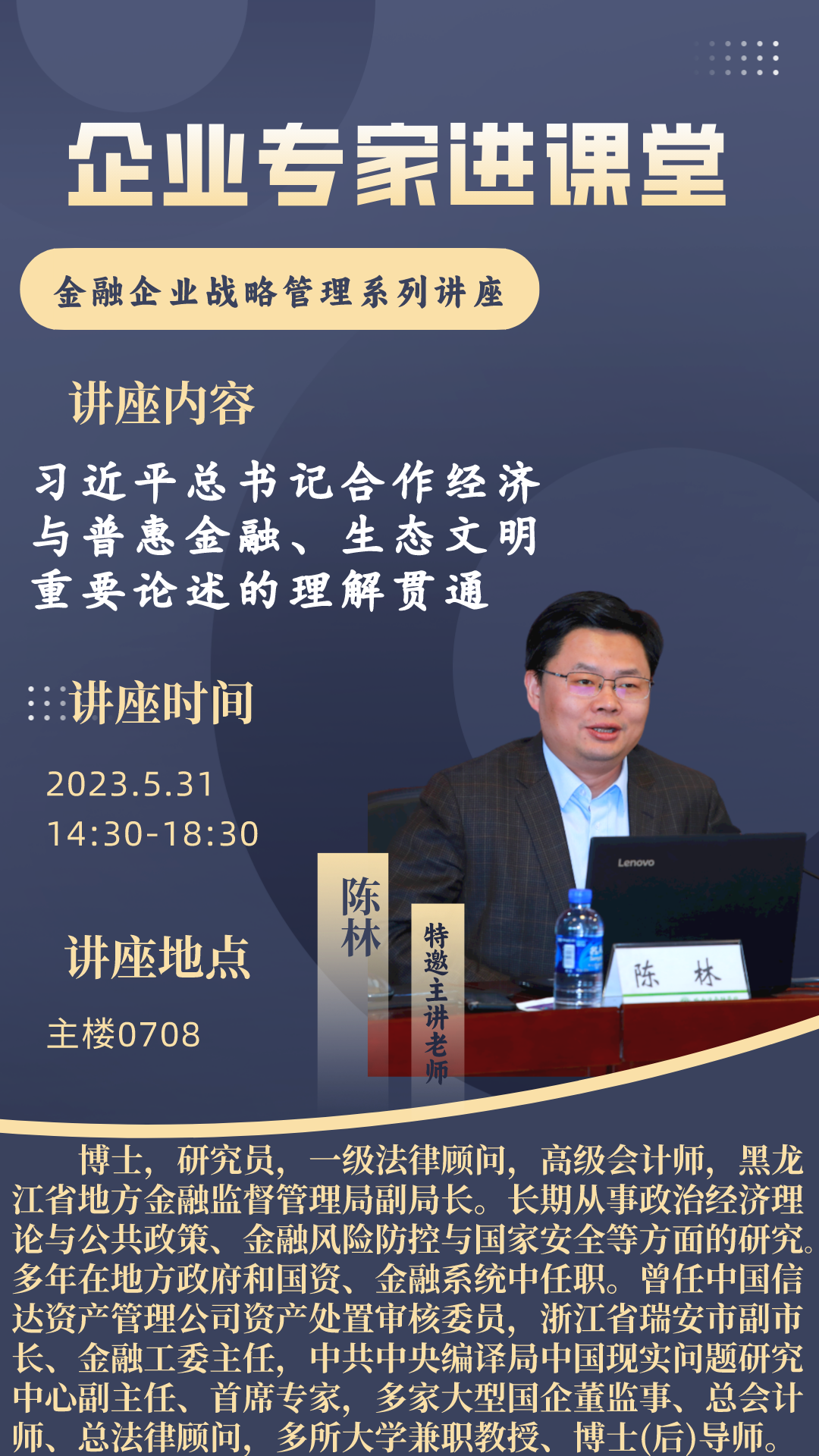 为进一步落实《关于深入推进世界一流大学和一流学科建设的若干意见》(教研〔2022〕1号)和《教育部高等教育司2022年工作要点》等文件精神,为进一步深化校企合作,提升学生综合素质,拓展学生的视野。金融学院决定举办“企业专家进课堂”——金融企业战略管理系列讲座,讲座共计7场。