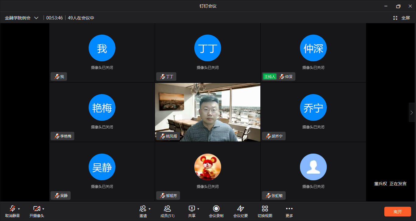 2022年5月15日19点,金融学院召开了全体教师例行大会。会议主题是部署疫情期间期末重点工作,会议形式为钉钉线上。金融学院全体教师出席本次会议,会议由金融学院院长姚凤阁主持。