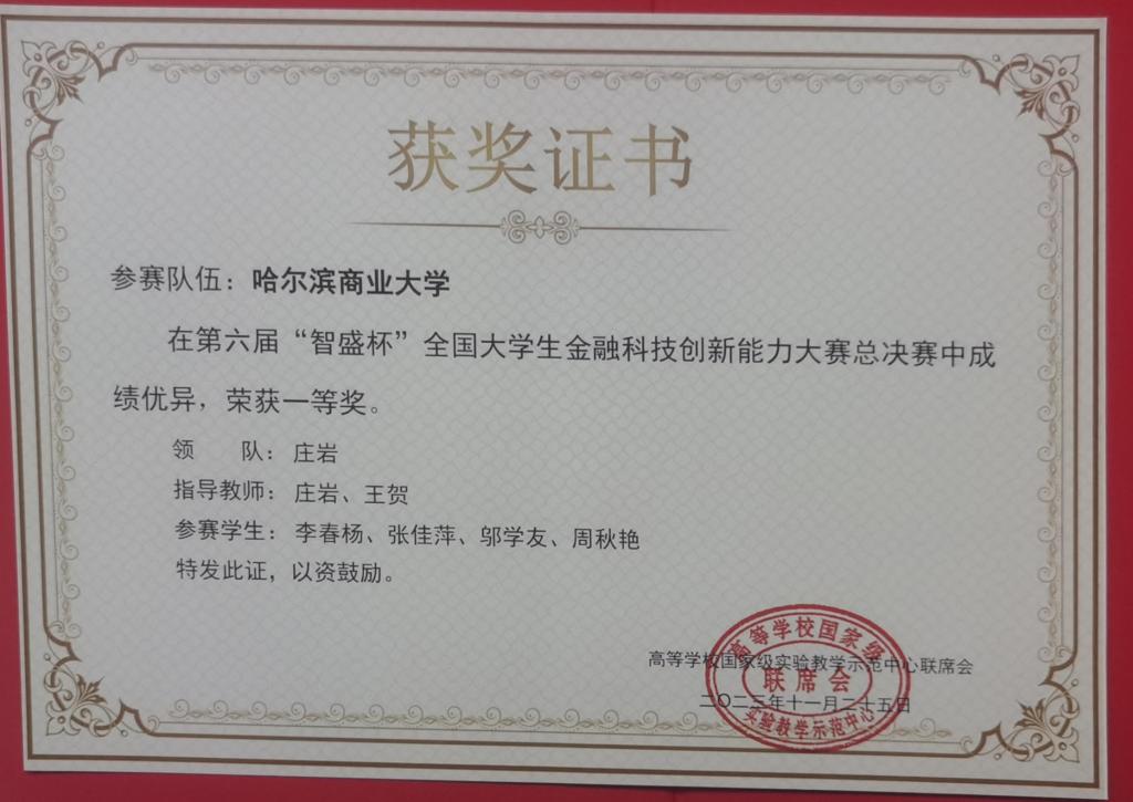 11月25日,我校派出一支参赛队伍参加“智盛杯”全国总决赛,经过激烈角逐,荣获全国总决赛一等奖(第三名)的优异成绩、庄岩老师和王贺老师荣获优秀指导教师称号、哈尔滨商业大学获得最佳组织奖。