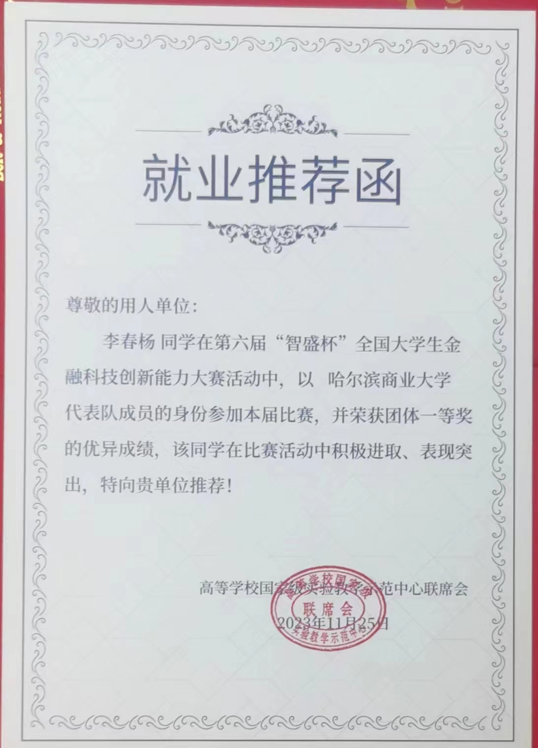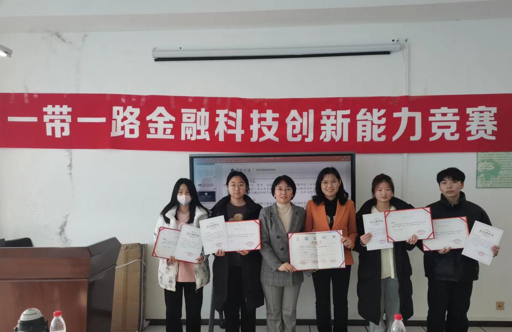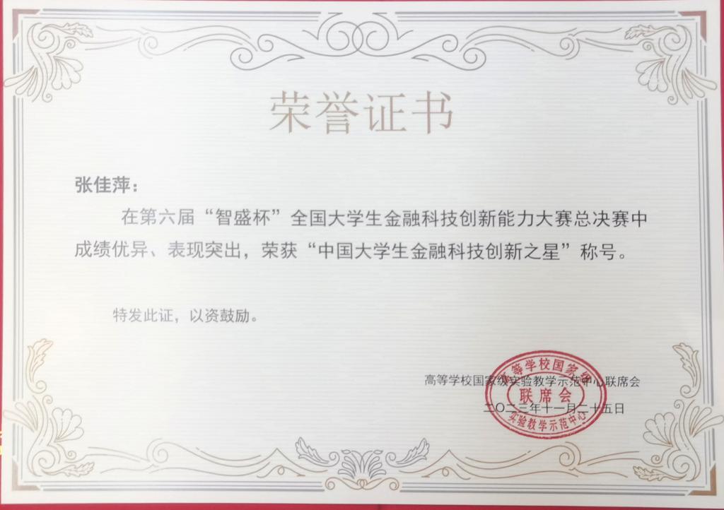 全国总决赛金融学院参赛选手李春杨、张佳萍、邬学友、周秋艳四位同学获得“中国大学生金融科技创新之星”称号,并获得由高等学校国家级实验教学示范中心联席会出具的就业推荐证书。