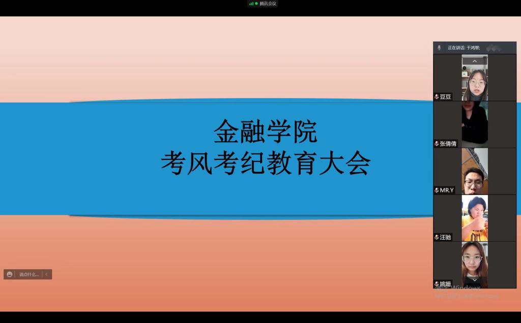 为了培养学生的诚信品质,严肃考风考纪,在期末考试和全国大学英语四六级考试到来之际,金融学院于2021年11月30日针对各年级学生进行了考风考纪教育。院团委副书记罗楠、院团委副书记衣弘扬、2020级辅导员于鸿翠、2021级辅导员姜禹奇及院内全体同学参加了线上考风考纪教育大会。