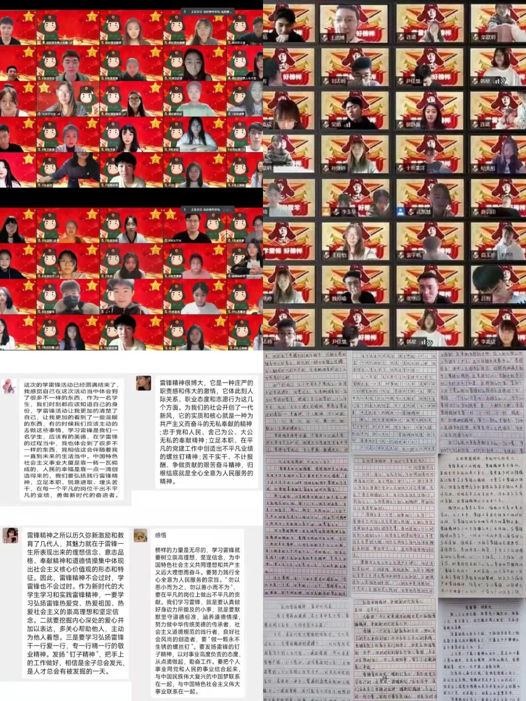 通过此次学习雷锋精神的主题活动,同学们进行深入的交流与讨论,进一步认识到我们要弘扬雷锋热爱党、热爱祖国、热爱社会主义的崇高理想和坚定信念。作为新时代的大学生,更要自觉地把个人的追求和奋斗同党的事业、国家的命运、民族的前途联系起来,要着眼新时代,与时俱进,争做新时代青春赶考人,为祖国的繁荣发展贡献自己的智慧和力量。