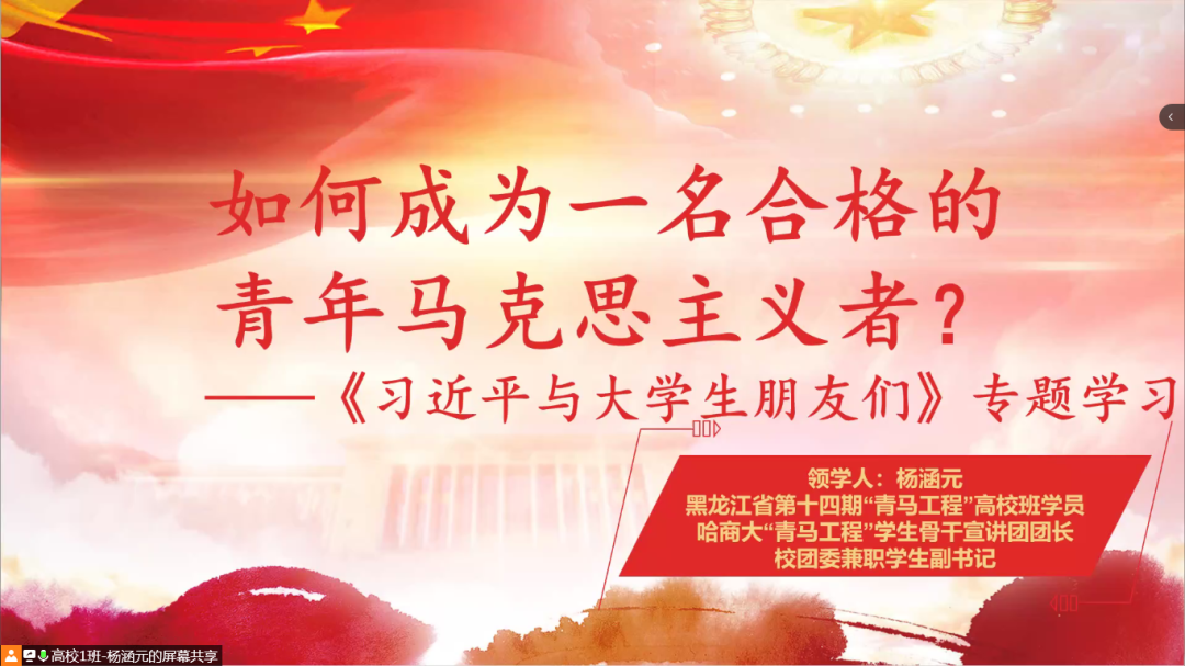 为深入学习贯彻落实总书记关于青年工作的重要思想,发挥好广大青年全面建设社会主义现代化国家新征程的作用,金融学院团委于2022年4月20日举行《习近平与大学生朋友们》专题学习会议,会议由黑龙江省第十四期“青马工程”高校1班学员、校“青马工程”学生骨干宣讲团团长、校团委兼职学生副书记杨涵元同学领学,金融学院青马工程培训班成员、2020级和2021级团支书通过腾讯会议参会。