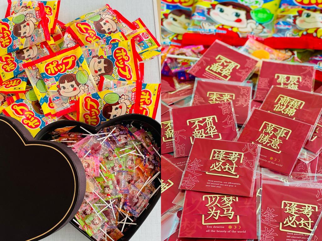 “考研加油包”中包括印有“不负韶华”、“成功上岸”、“星辰大海”、“逢考必过”等祝福语的精美书签,以及“一研为定”美好寓意的爱心糖果,鼓励同学们在考试期间保持良好心态,全力以赴迎接考试。
