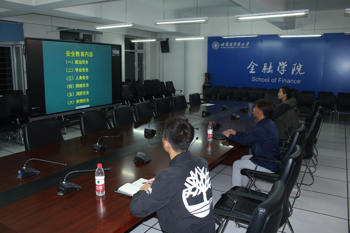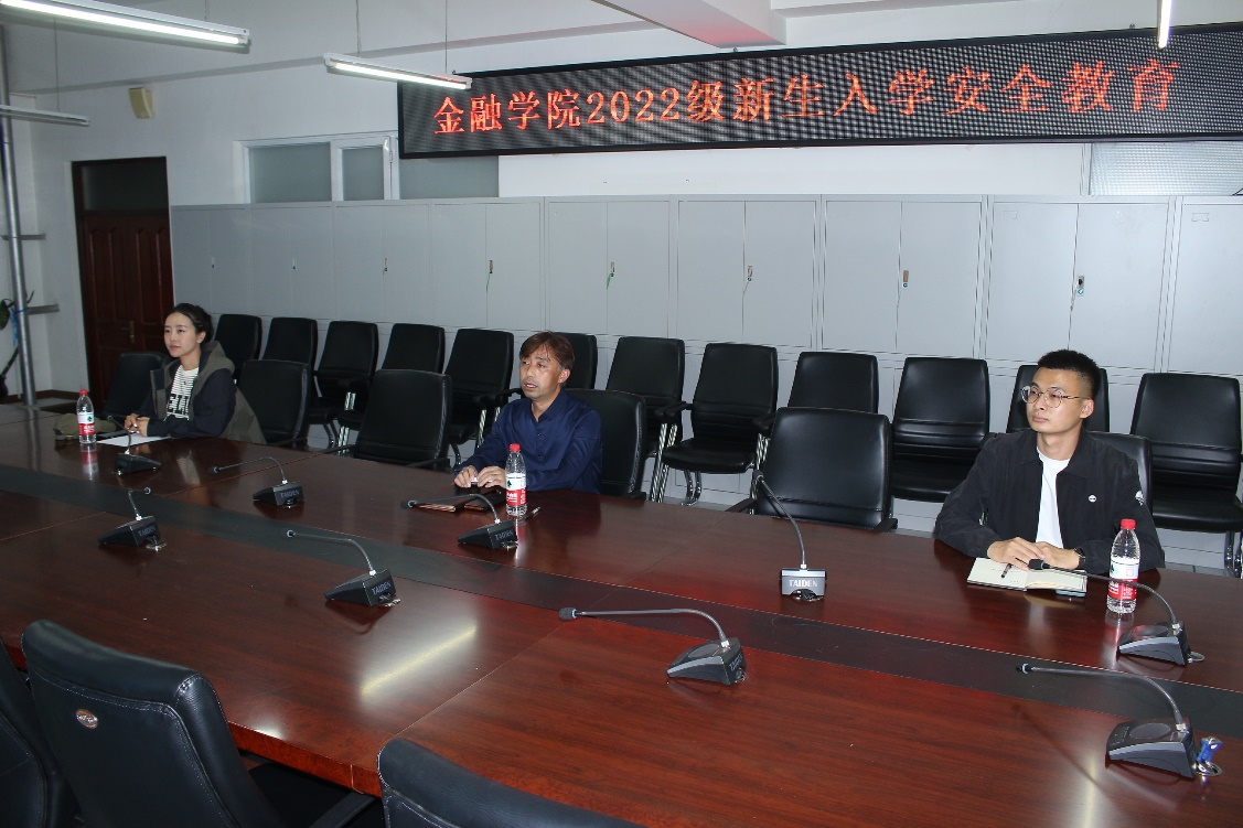 2022年9月19日晚上18:00,金融学院对2022级新生开展了入学安全教育,参加安全教育的有学院党委副书记董兵权、新生辅导员衣弘扬、王鹏老师和2022级全体本科新生。受疫情影响,安全教育采用腾讯会议线上方式进行。