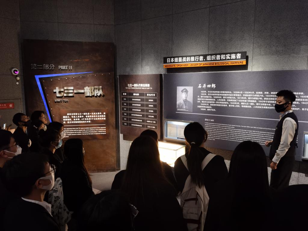 陈列馆内,一排排历史遗物整齐地摆放在置物架上,向人们展示着当年侵华日军的滔天罪证。讲解员从侵华日军的细菌战讲起,从细菌战的指挥架构体系,到细菌战部队在中国的分布,从规模巨大的杀伤性细菌武器的研究、试验和生产,到惨无人道的活体实验。详细讲述了当年日本七三一部队如何进行数十种试验,带给千千万万的中国人终身的病痛和折磨,历史的真相不会因时代的变迁而被遗忘。
